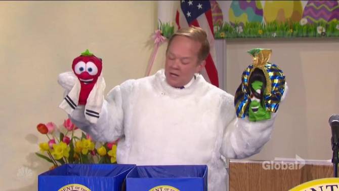 The segment opened with Spicer wishing the children playing in front of his podium a happy Easter, before promptly telling them to get out and the audience to shut up.
