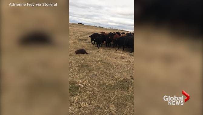 Ranchers northeast of Regina are shaking their heads after watching a herd of curious bovines slowly follow a beaver across one of their pastures.