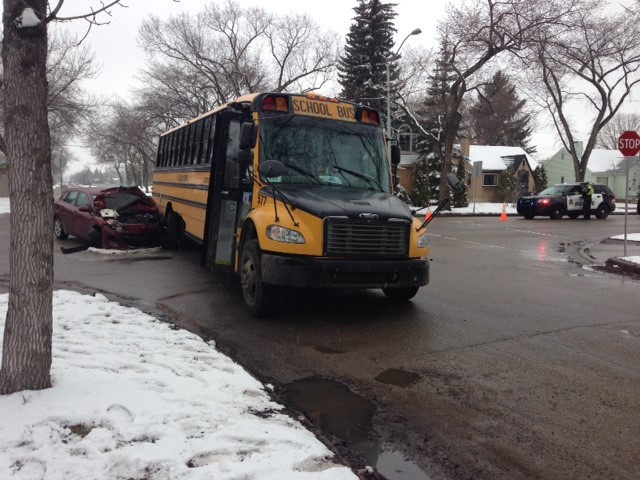 A couple of children sustained minor injuries Tuesday afternoon when a car collided with their school bus just north of Edmonton’s downtown core.