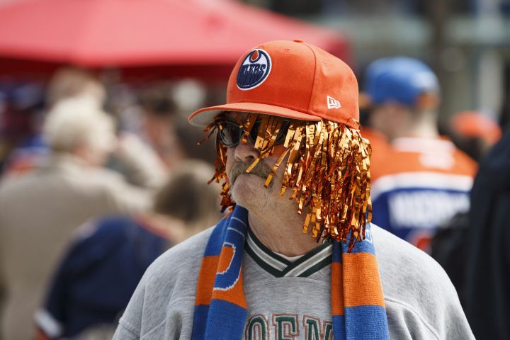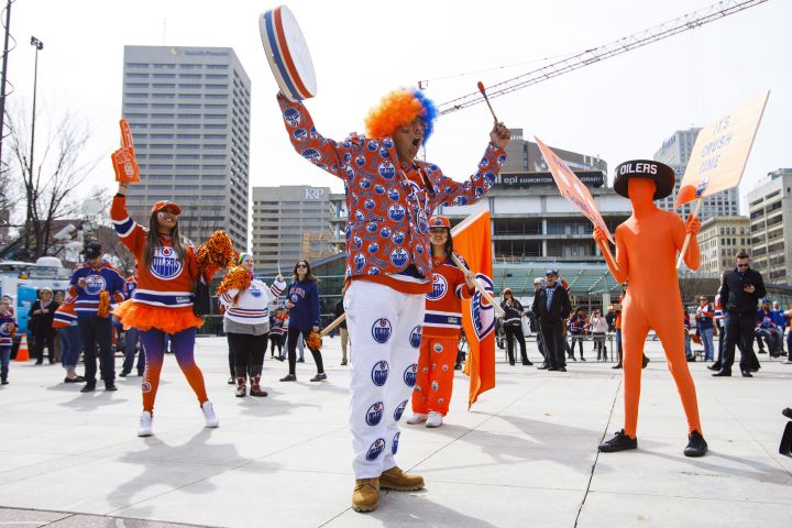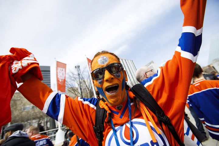 Fans dressed in Oilers gear, proudly waving Oilers flags, gathered to show support for the team as they get set to play Game 5 against the San Jose Sharks at home Thursday night.