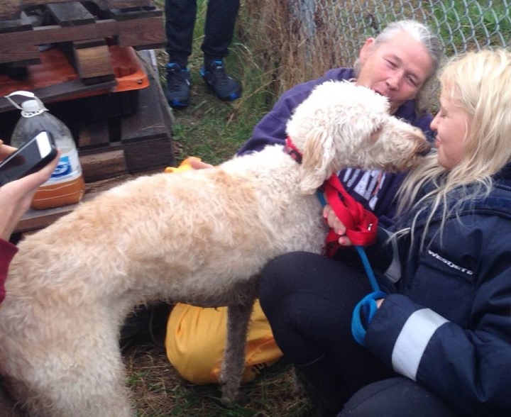 A photo of the dog re-uniting with its owner was posted on a “Lost and Found Pets” Facebook group Friday morning.