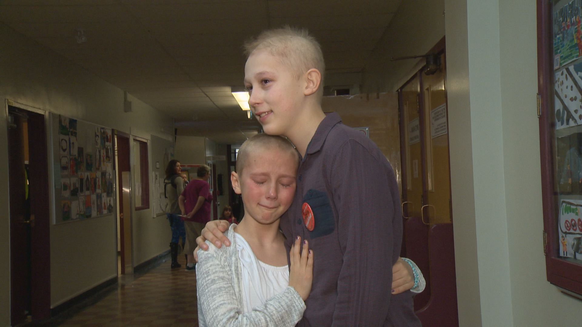 When Sofia Smith sat down to say good bye to her long blonde hair Friday, she couldn’t help but get emotional. Tears flowed down the nine-year-old Calgary girl’s cheeks as a volunteer cut large sections of her locks before taking a razor to her scalp.