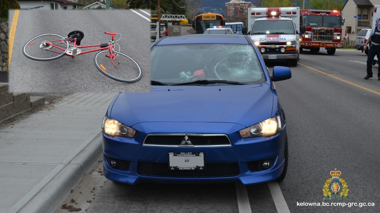On Tuesday morning, RCMP responded to an accident involving a car and a cyclist near the intersection of Bernard Avenue and Elm Street. Police say the cyclist, a 20-year old woman, was initially reported to be found unconscious.