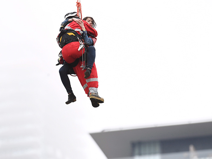 A firefighter specializing in high-climb rescues was sent in to climb the crane boom and rappel down to the woman, eventually bringing her to safety.