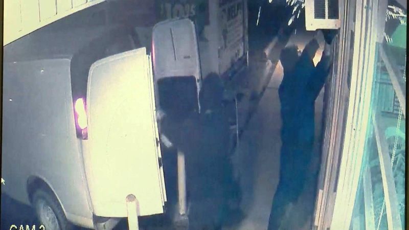 Surveillance video from the business appears to show two men in dark clothing exit a white van and use a grinder to a cut the bolt on the top left-hand side of the door.