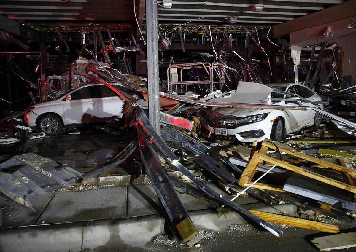Video from local television stations showed uprooted trees and overturned cars along rural, wet roadways, along with at least two flattened homes. The tornado flipped pickup trucks at a Dodge dealership in Canton and tore through the business.
