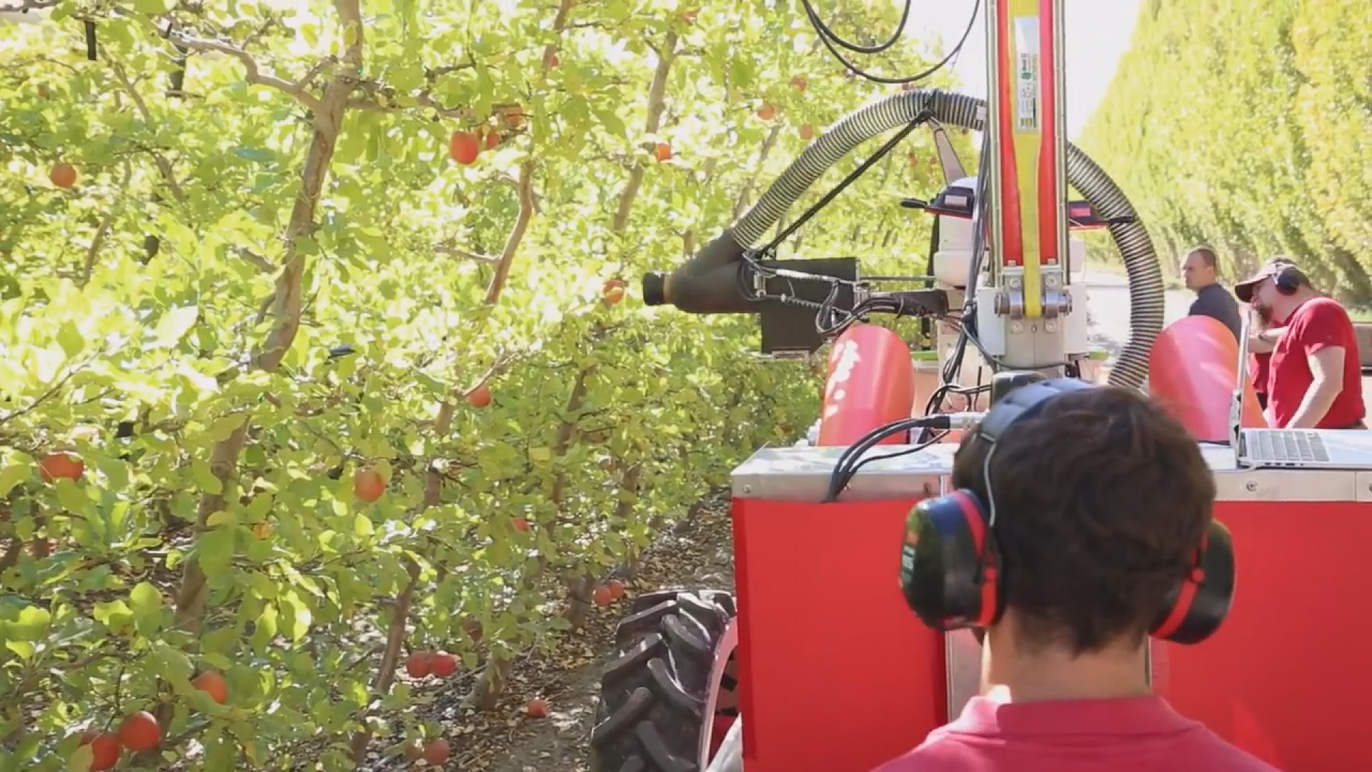 A couple of American companies are testing different prototypes of automated apple pickers.