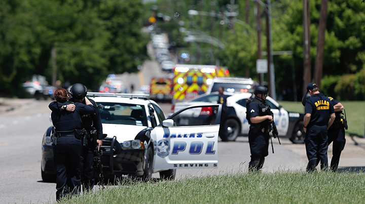 The Dallas Police Association tweeted earlier Monday that officers responding to an active shooter were “pinned down” by gunfire.