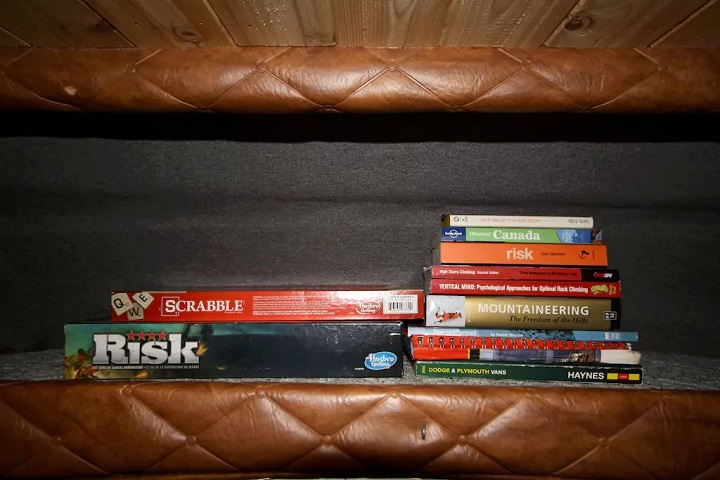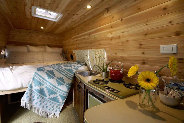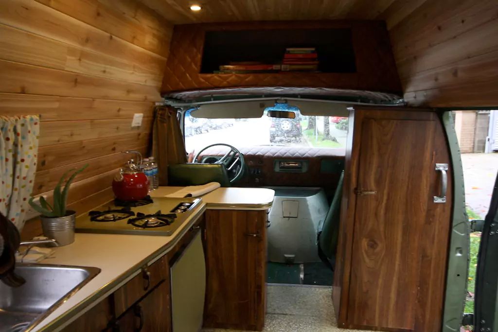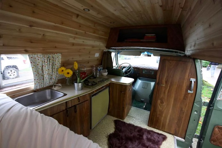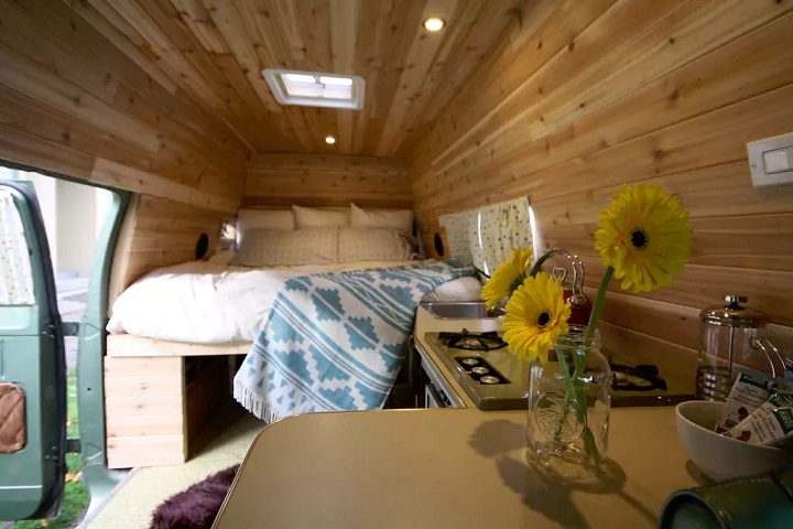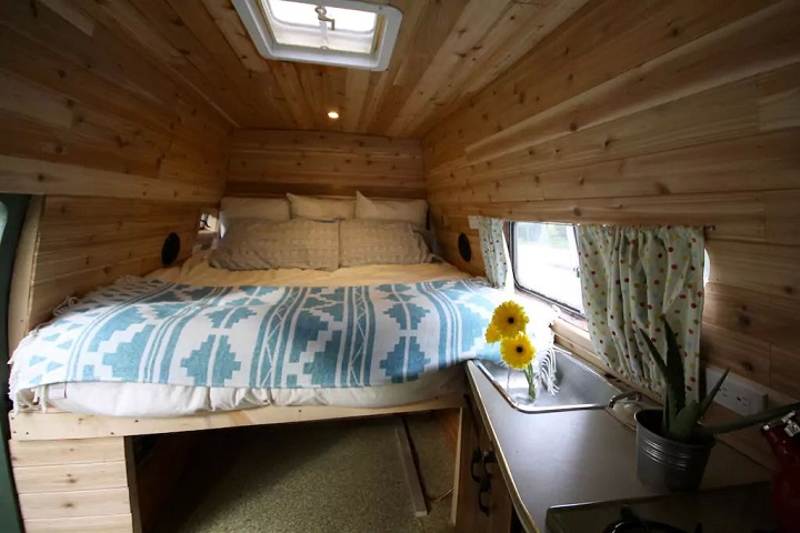 But the space is a little unconventional – it’s a refurbished, stationary camper van that’s the colour of a field cucumber.