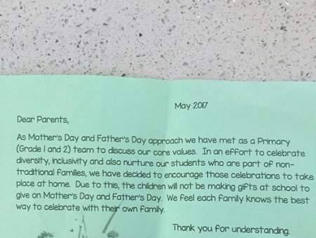 “In an effort to celebrate diversity, inclusivity, and also to nurture our students who are part of non-traditional families, we have decided to encourage those celebrations to take place at home. Due to this, the children will not be making gifts at school to make on Mother’s and Father’s day. We feel each family knows the best way to celebrate with their own family.”