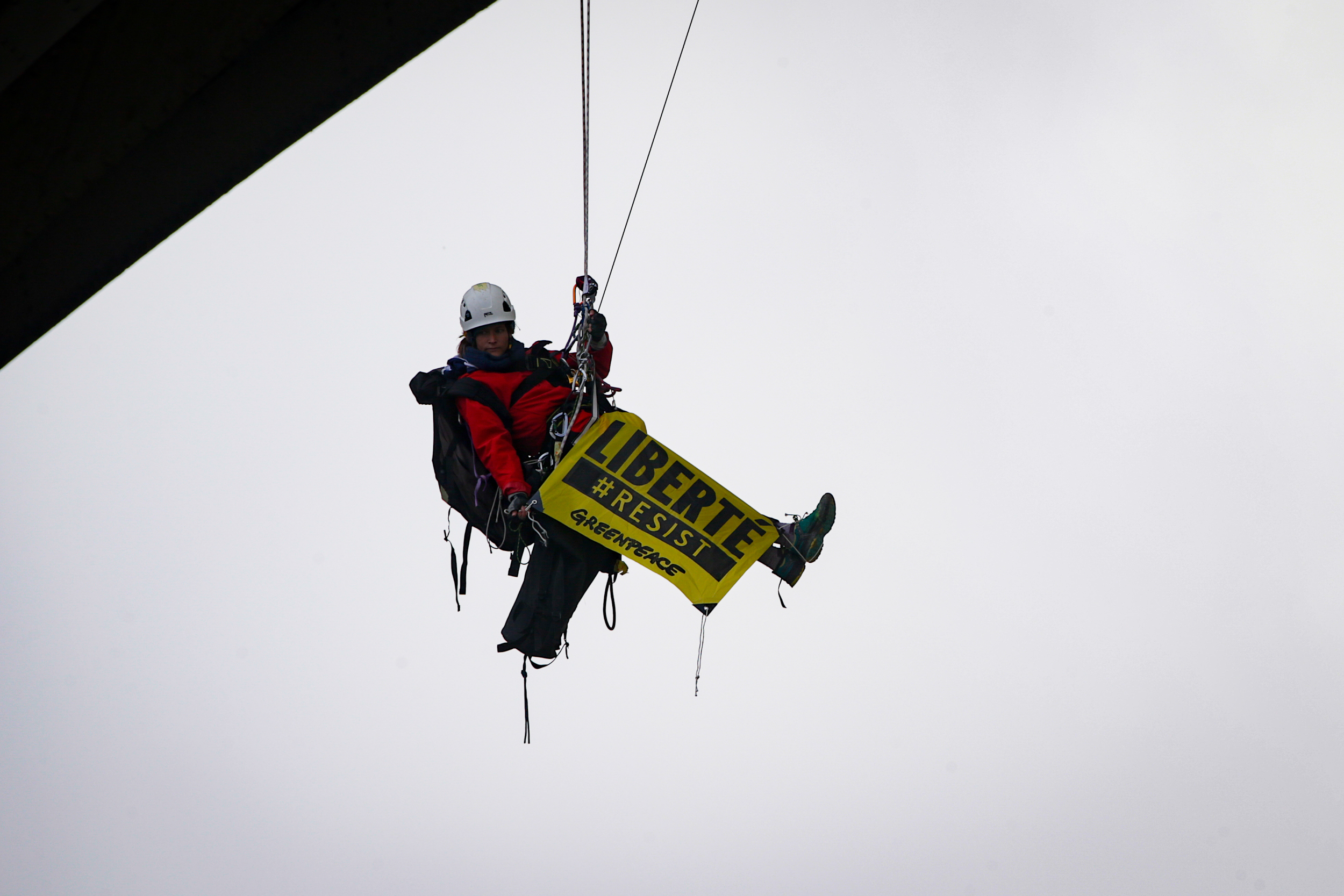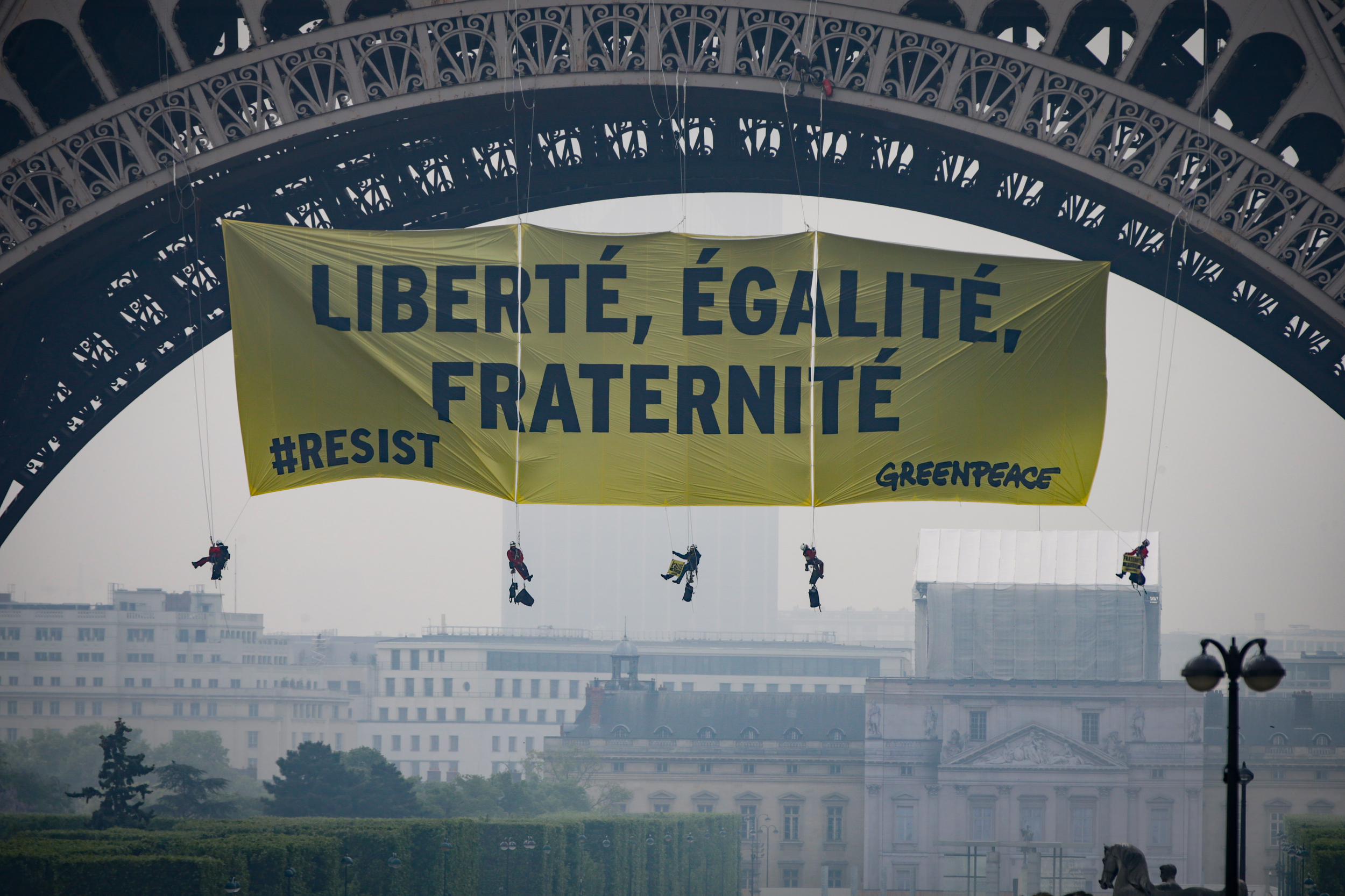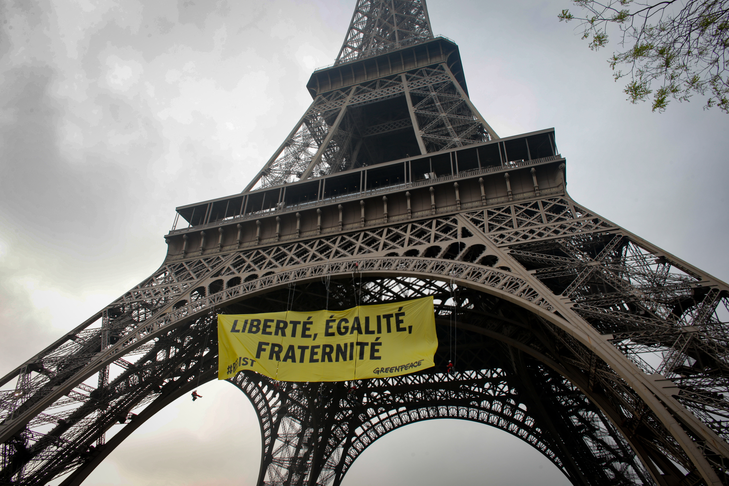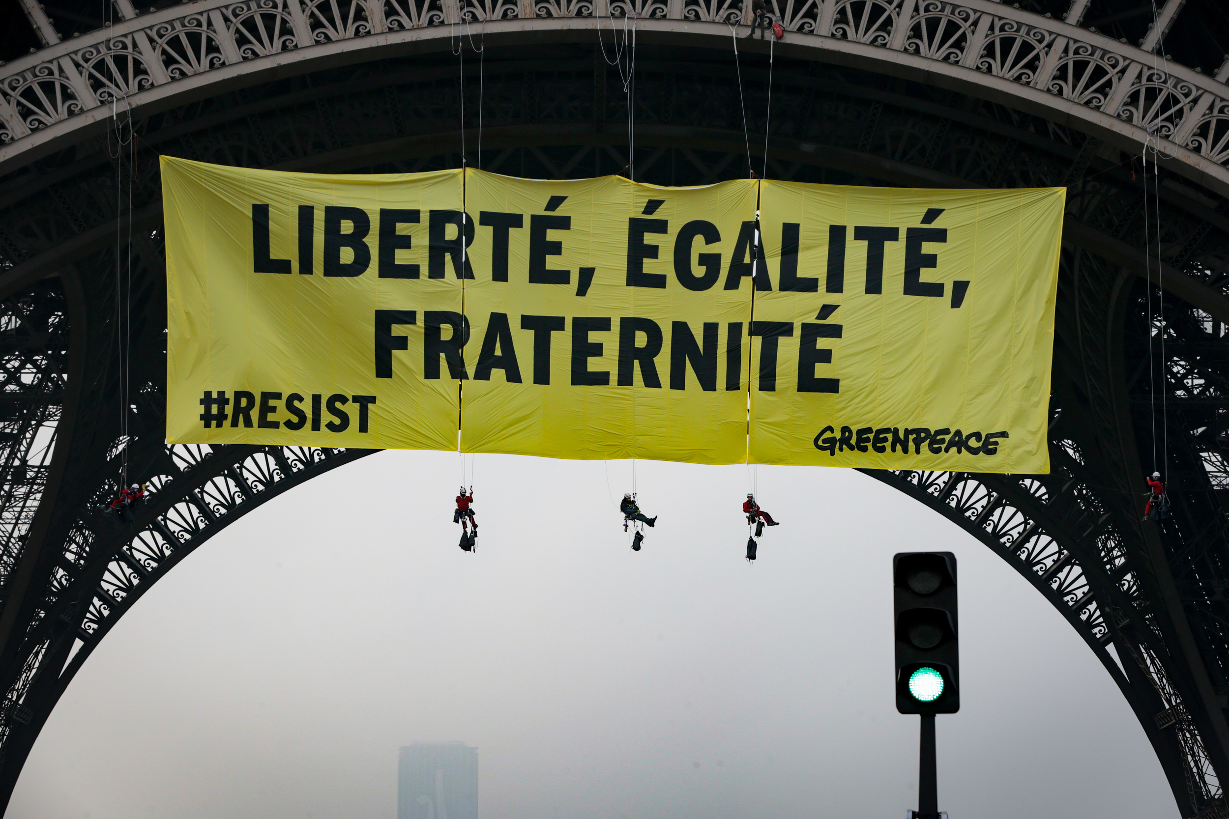 “Liberté Egalité, Fraternité,” read the banner strung between the legs of the Paris icon, along with the hashtag #RESIST stamped in the lower left-hand corner. Greenpeace activists climbed the monument as “a wake-up call,” said the French executive director of the group, Jean-Francois Julliard, in a statement sent to Global News.
