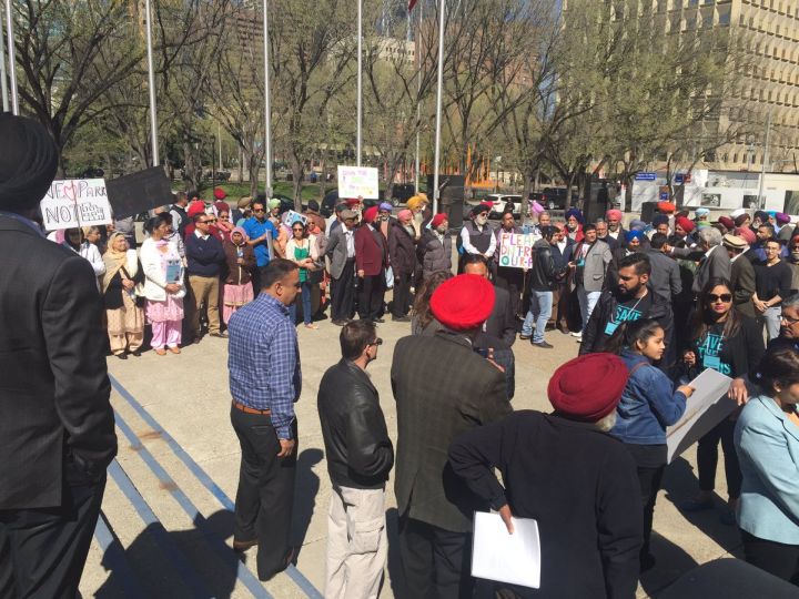 Some 100 people gathered outside city hall on Monday to protest a proposed development next to the Genesis Centre in northeast Calgary.