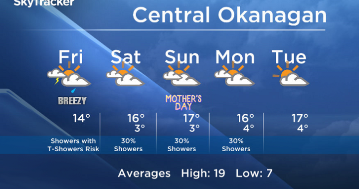 A cold front will move across the BC Southern Interior Thursday night and early Friday with showers and the risk of thundershowers under a flow from the south.