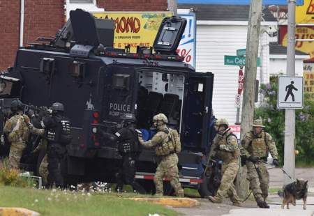 Hundreds of police officers would flood into Moncton, including three of the RCMP’s four emergency response teams in the Atlantic region, as well as those from the Quebec and national division, and tactical teams from nearby municipal forces. They were accompanied by medics, technicians, 11 police dog teams, an explosive disposal unit and special investigators. Several aircraft and five armoured vehicles were deployed to the scene.