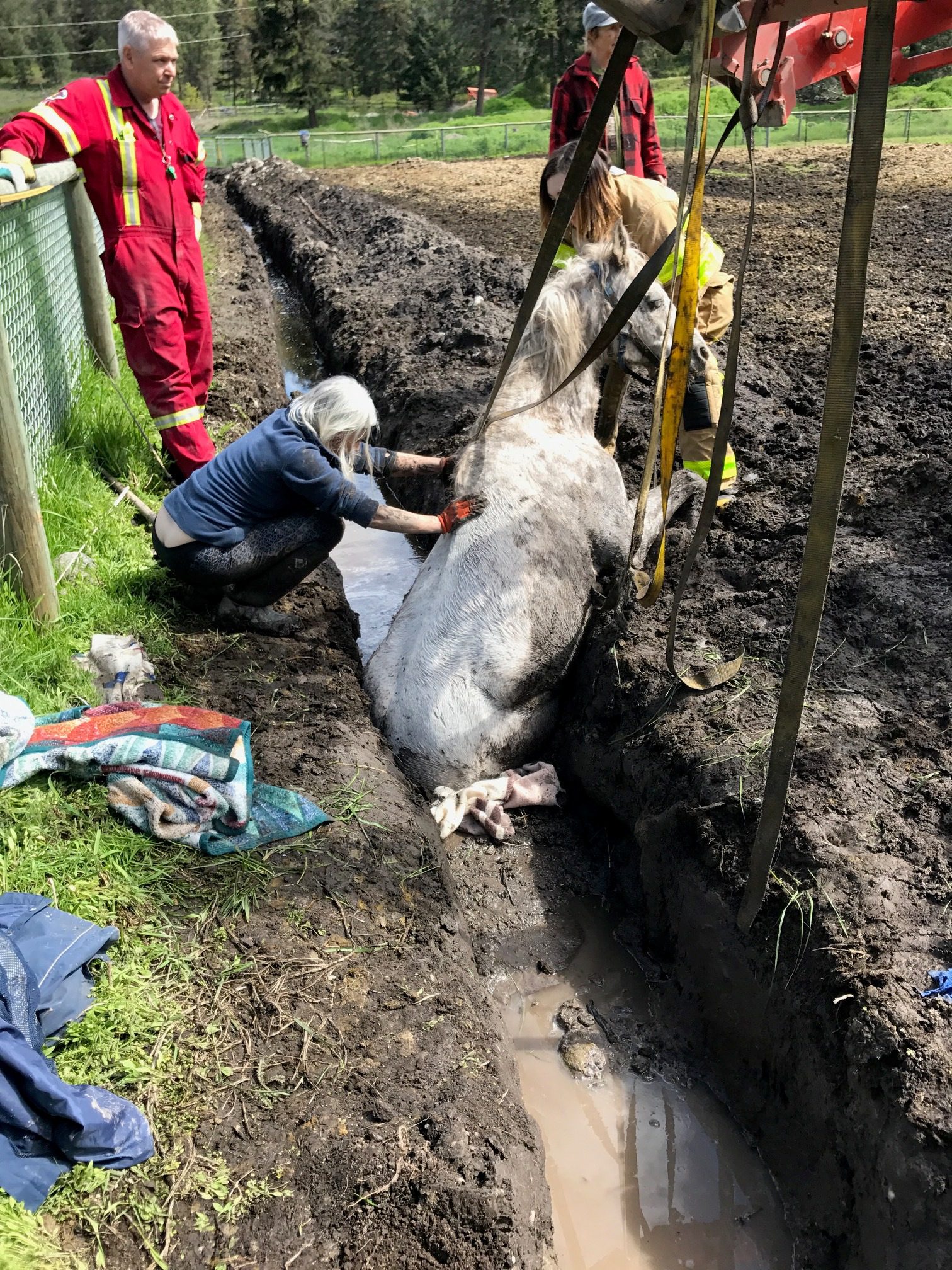 The horse was stuck in a muddy drainage ditch for up to ten hours. Her owners dug the ditch to deal with excess water runoff from recent flooding and believe Shaughnessy fell into it sometime Tuesday night.