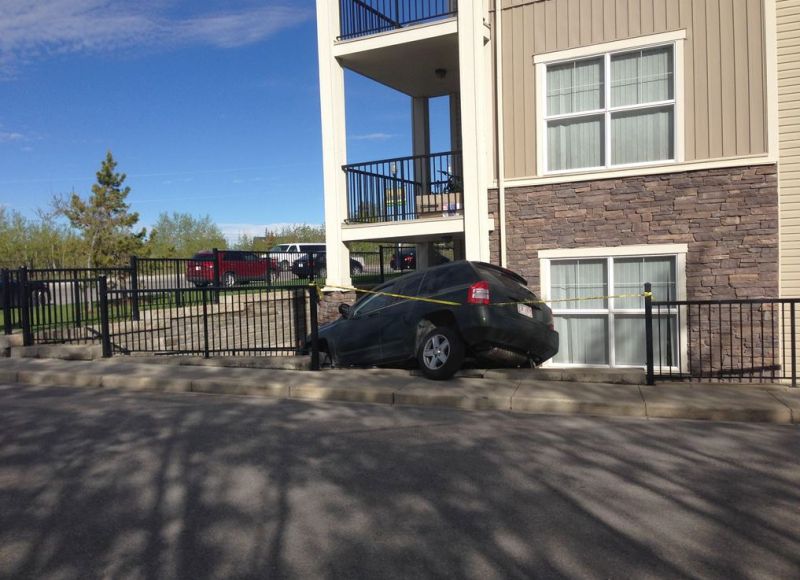 Emergency crews were called to Springbank Hill on Thursday after a Jeep crashed into the side of a condo building.