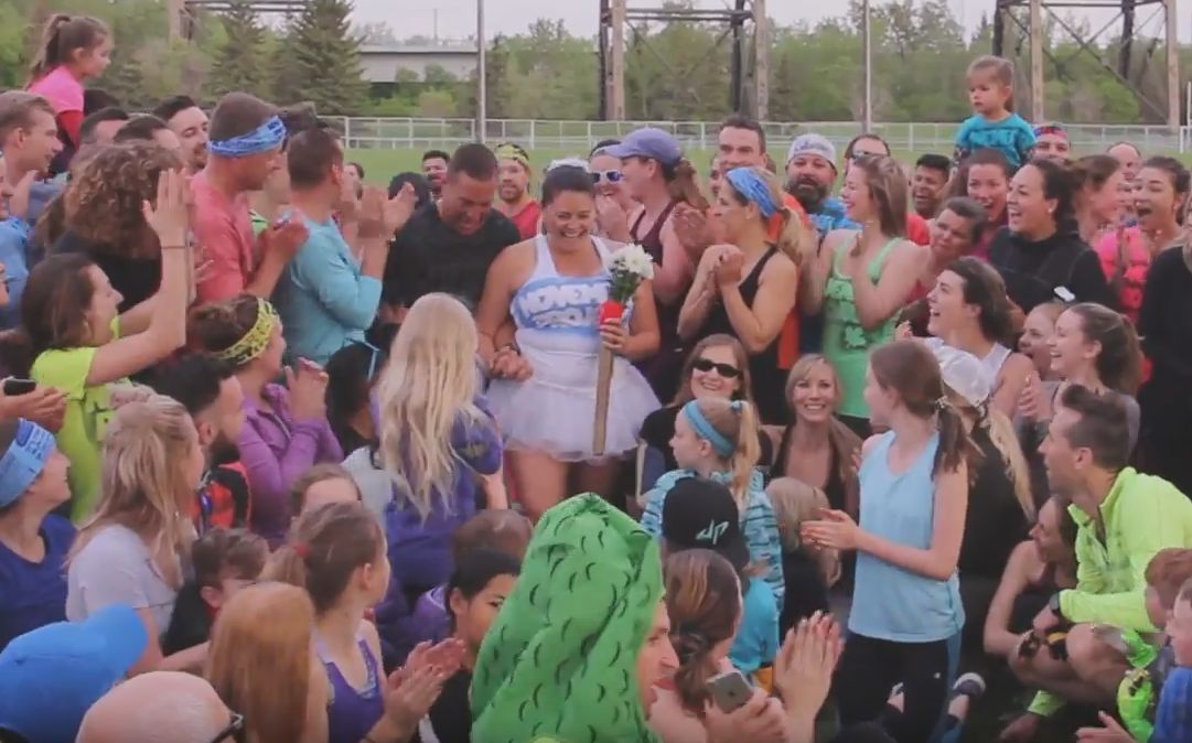At the the end of the group workout, one of the organizers teases something “historic” is about to happen, before asking, “Does anyone have a wedding?”