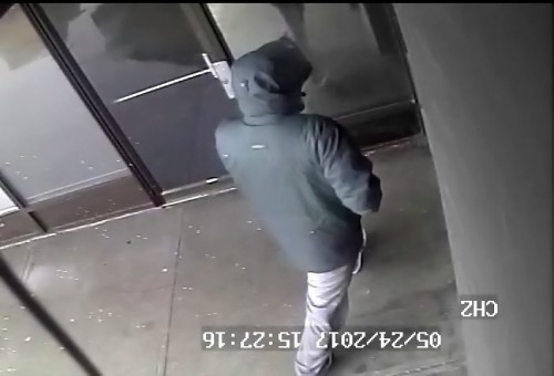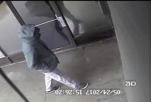 The man is described as wearing a black hat, a black jacket with a white emblem at the top of the hood and a black face covering. He was also wearing light grey sweat pants and black Converse sneakers with white soles.