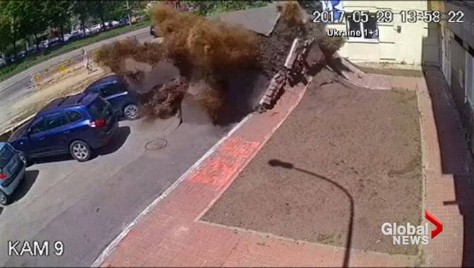 A woman was seen walking nearby in the video. While she was hit by flying debris, she escaped without injury.