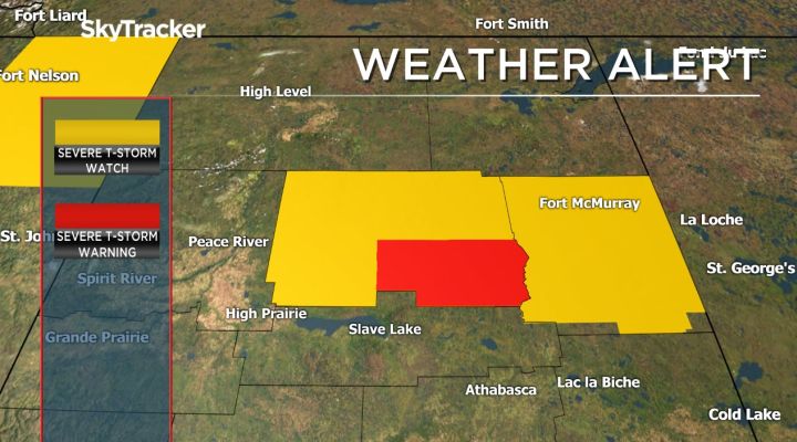 By 7:35 p.m., warnings were dropped for Slave Lake, Westlock, Barrhead and Athabasca while a new severe thunderstorm warning was issued for Wabasca, Peerless Lake, Gift Lake and Cadotte Lake.