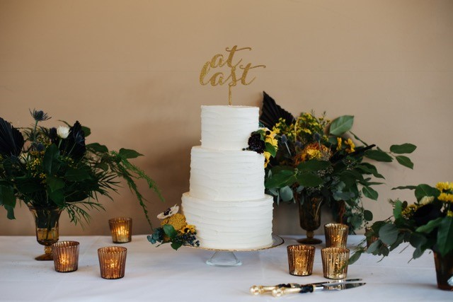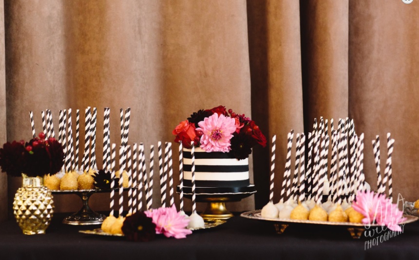 Food and drinks for the dinner reception. We had a six-course meal, an open bar and a sweets table after dessert with a collection of cookies, tarts, cheesecakes, panna cotta, and popcorn.