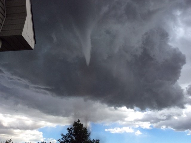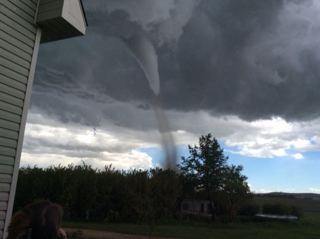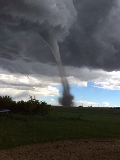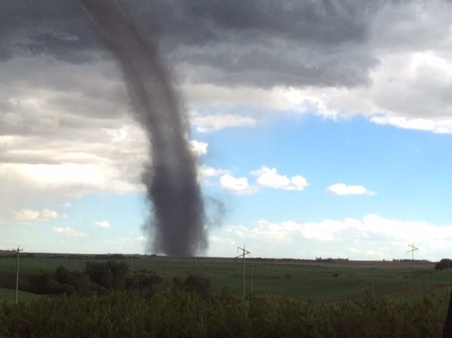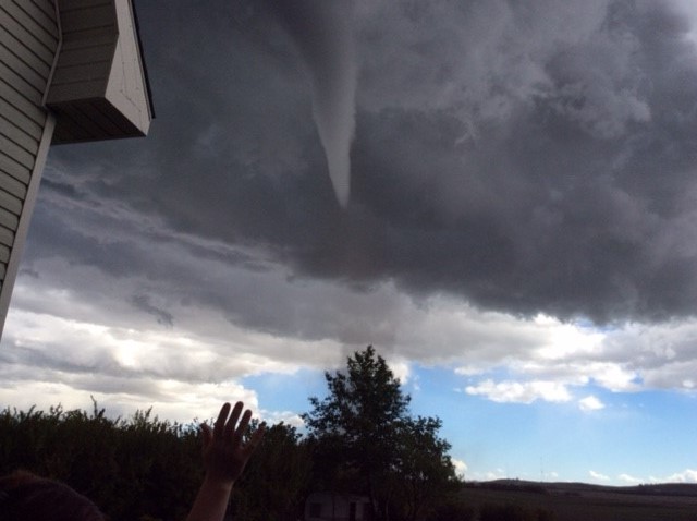 Joanne Olson captured video footage of the funnel cloud while she was very close to it in the north end of Three Hills, Alta. The woman – from Stony Plain, Alta. – said she and her husband had just arrived into town for a weekend family reunion when they unpacked their bags at a friend’s house and saw the rotating cloud.
