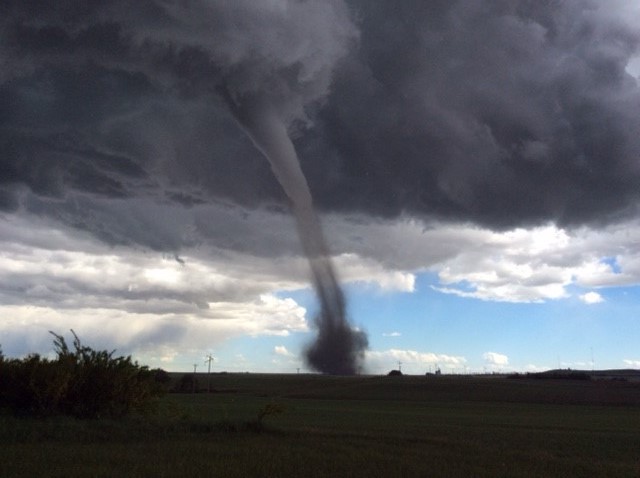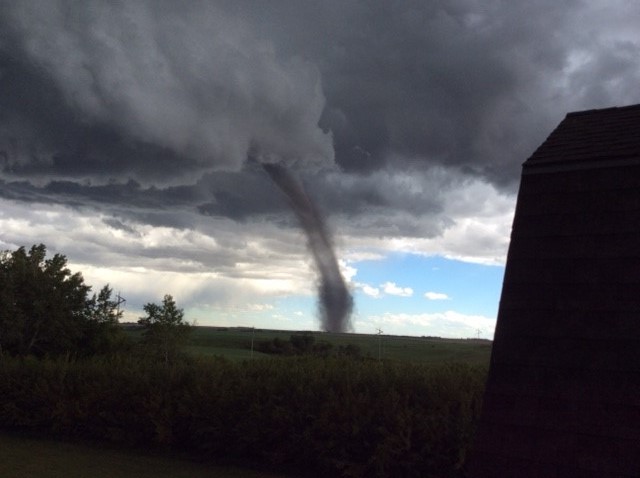 UPDATE: June 5, 2017: On Monday afternoon, Environment Canada adjusted its rating of the tornado from an EF-0 to an EF-1 on the Enhanced Fujita scale, which ranges from the weakest (EF-0) to the strongest (EF-5). On Friday, the weather agency said the twister generated wind speeds of up to 130 km/h and that the only damage it had received reports of was a shed roof that was destroyed. On Monday, Environment Canada said the twister had generated wind speeds of up to 175 km/h and that the tornado threw an “anchored empty grain bin” 400 metres, shifted a semi-filled grain bin, destroyed an RV and snapped some trees in addition to damaging the roof of a barn.