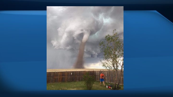 A photo of a man in Alberta mowing a lawn with a tornado swirling behind him has been causing a bit of a storm on social media.