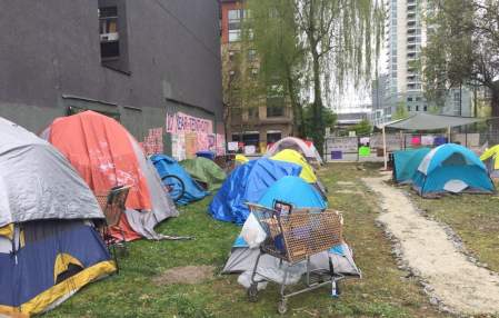 But this time, homeless campers at the “Ten-year tent city” aren’t facing off against the City of Vancouver, which owns the land.