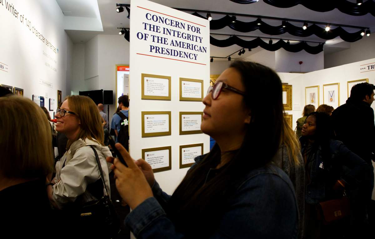 The library is an attempt at a birthday gift for the president – who Daily Show host Trevor Noah said during a recent episode received a lawsuit on his birthday. The gallery displays some of Trump’s best-known tweets on the social media platform.