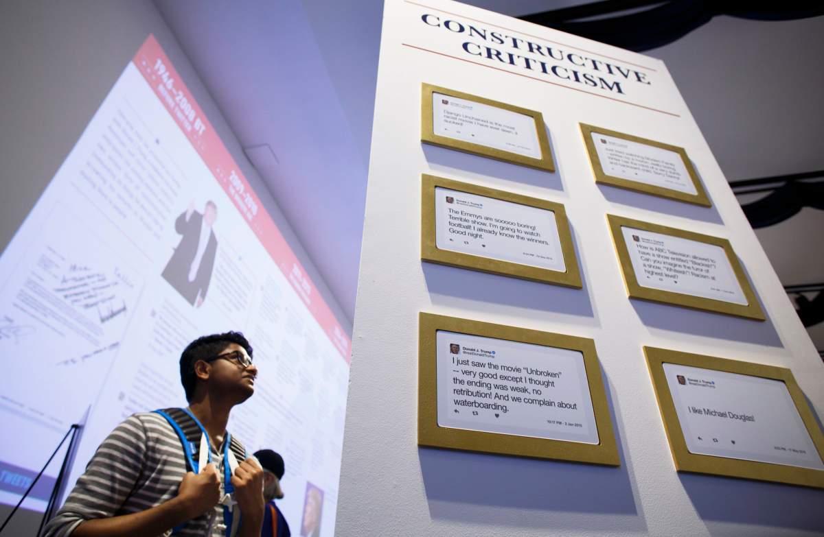 Trump’s tweets are sorted into several categories including “Constructive Criticism,” “Deleted but not Forgotten” and “Always the Best.”