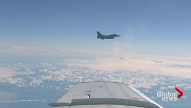 A Russian Sukhoi-27 fighter jet was then seen inserting itself between the F-16 and the minister’splane before tilting its wings from side to side to show the missiles it is carrying. The F-16 was then seen leaving the area.