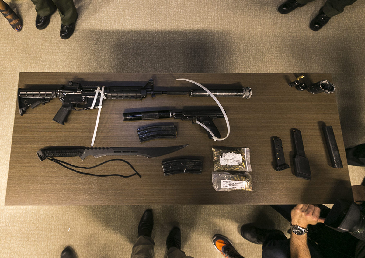 Inside a duffel bag, authorities found an AR-15 semi-automatic rifle with a collapsible stock that was loaded with a single bullet; a .40-caliber handgun with markings indicating its use was restricted to law enforcement or government use; several loaded high-capacity magazines and two small bags of bullets. There also were what appeared to be silencers machined from pipe, a machete-like knife, rope, a Bible and a notebook containing writings that investigators were still trying to decipher, authorities said.