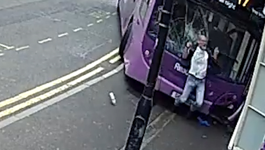 Amazing video captured in Reading, England, 80 kilometres west of London, shows a man walk away after an out-of-control bus plowed into him on Saturday.