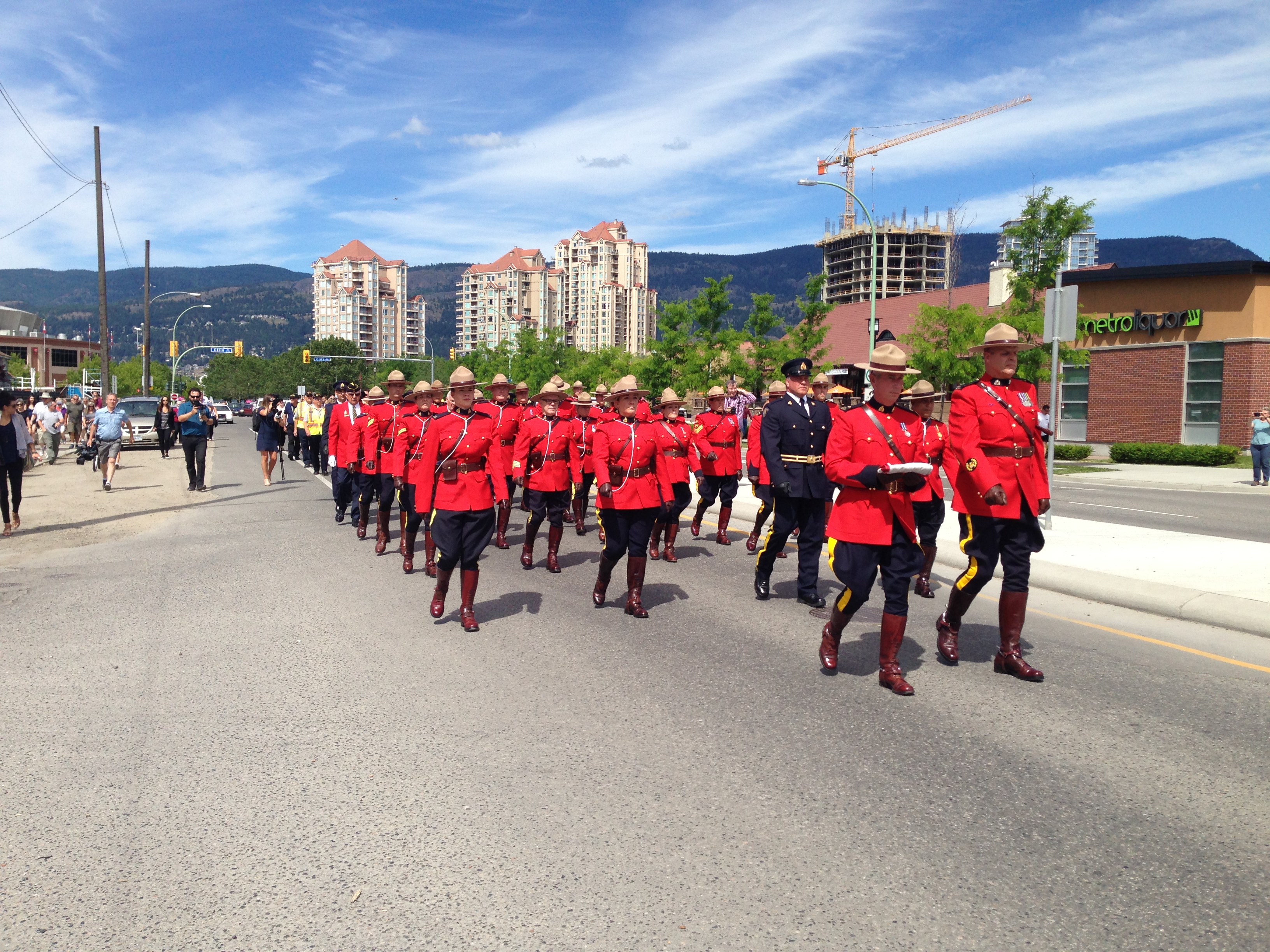 Officers in Red Serge, auxiliary constables and RCMP volunteers will march east on Doyle toward Ellis Street, turn left on Ellis Street, then right on Clement Avenue and end on Richter Street in front of the new detachment.