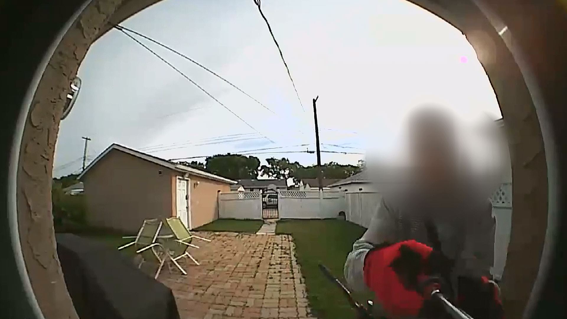 In the video, the man can be seen suspiciously looking around the backyard before walking towards the door.