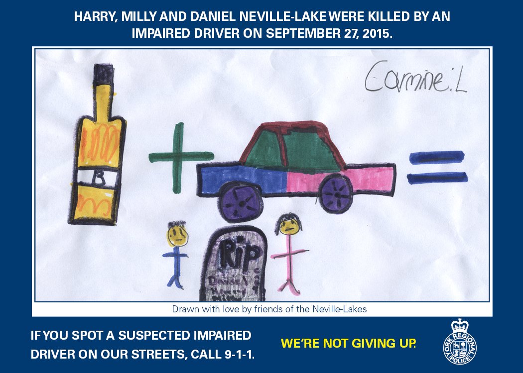 York Regional Police are circulating drawings on social media made by friends of nine-year-old Daniel, five-year-old Harry and a two-year-old Milly Neville Lake with the hope the message gets across that impaired driving is deadly.