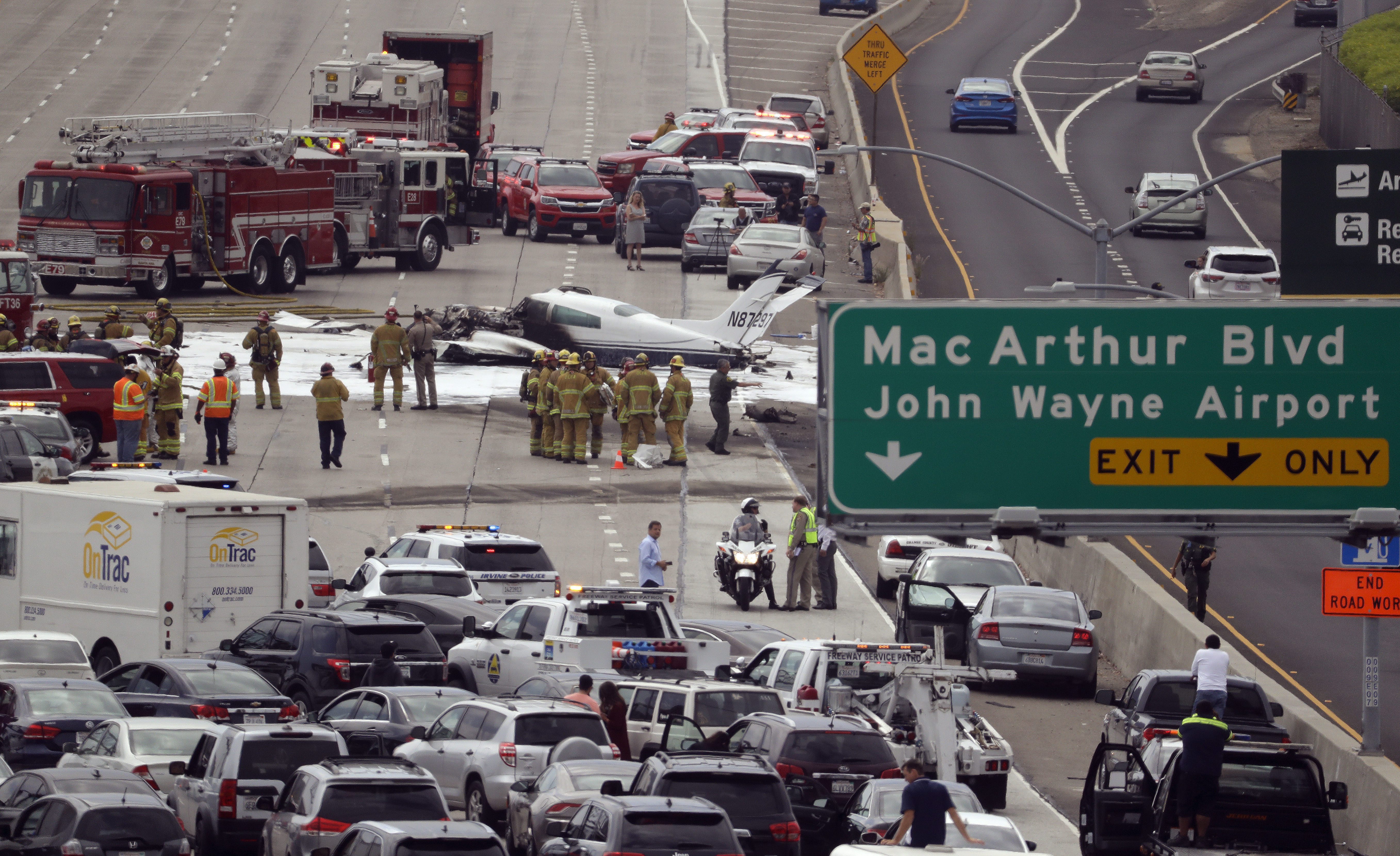 An off-duty fire captain, John Meffert, said he saw the plane flying low before it came crashing down on the freeway and was immediately engulfed in flames. Meffert, who has been a firefighter in Avalon for 17 years, said part of the wing hit his car, but he was able to pull over and went running toward the blaze.