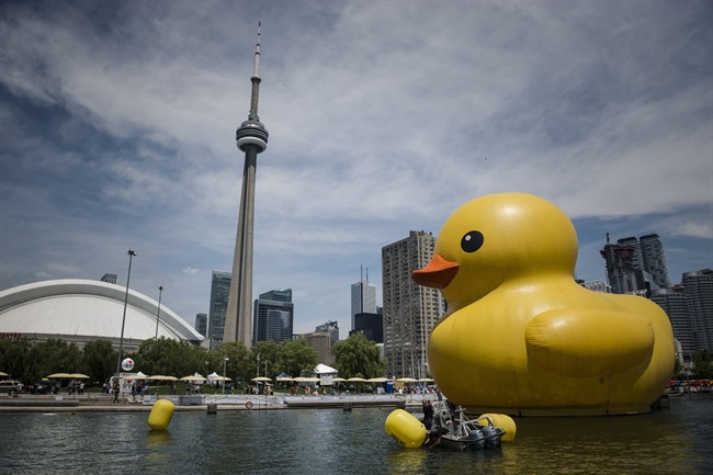 A giant inflatable duck sits on Toronto's Harbourfront as part of the Redpath Waterfront Festival, on Friday, June 30, 2017. THE CANADIAN PRESS/Christopher Katsarov