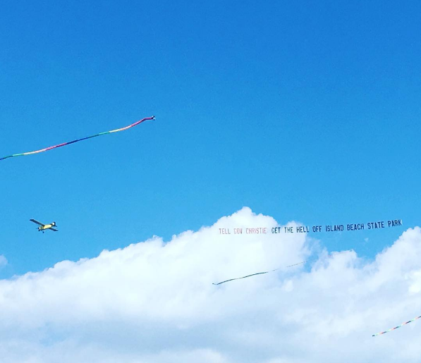 A plane carrying a banner that read “tell Gov. Chris Christie: Get the hell off Island Beach State Park” drew cheers and applause as it was flown along the coast of New Jersey Monday, one day after photos caught Christie sitting on a beach outside the governor’s summer house that was closed due to a government shutdown.