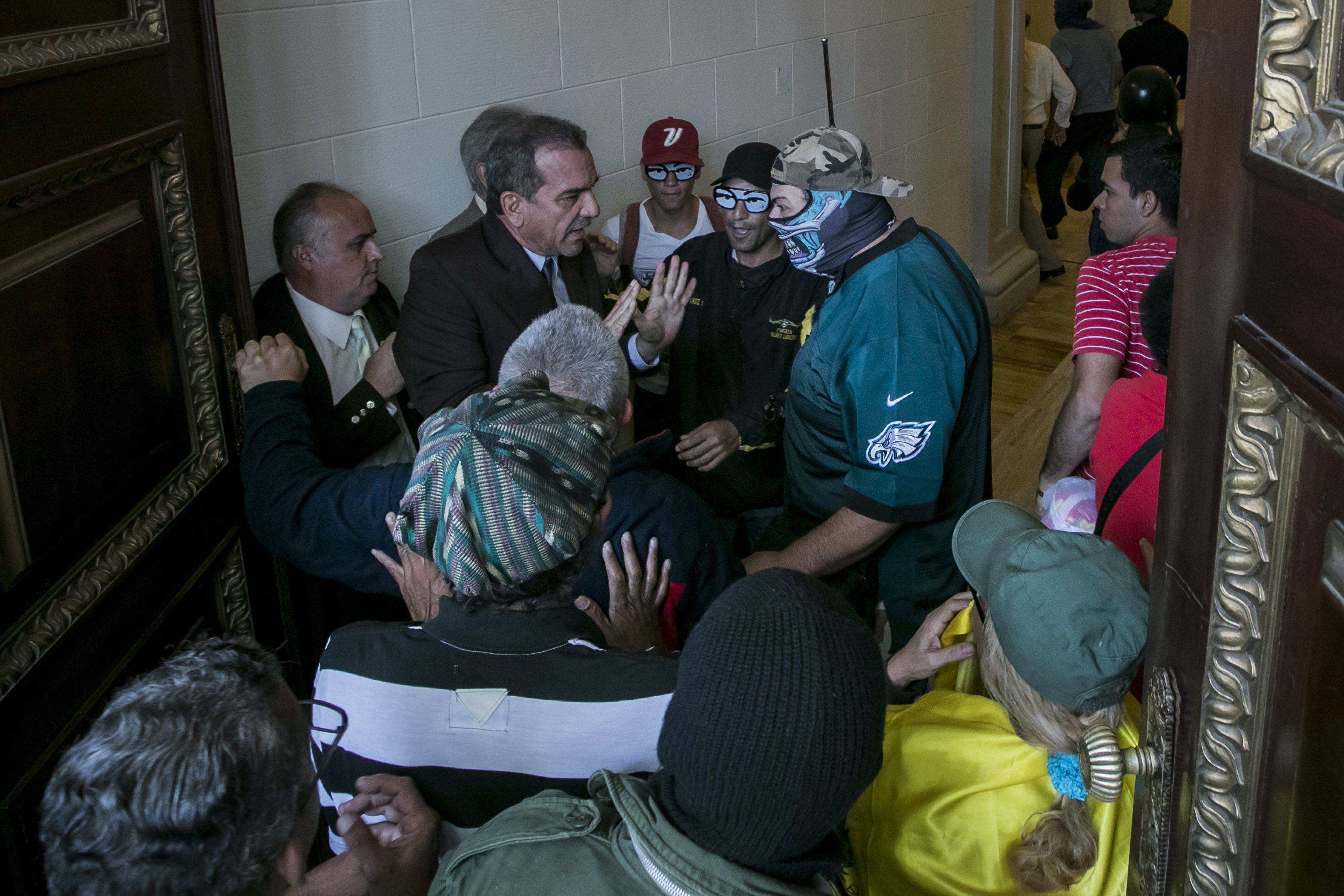 Hours afterwards by late afternoon, a crowd of roughly 100 people was still besieging the building, trapping people inside, witnesses said. Some of the those outside brandished pistols and some shouted they would cut water and power supplies.