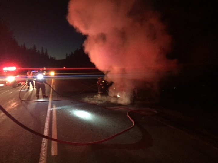 “We are assuming [the collision] ruptured a fuel line, or maybe because it was quite [a] heavy impact on the front of the vehicle it could have jarred the batteries, which could have shorted out and started the compartment on fire,” said Big White fire chief Jamie Svendsen.