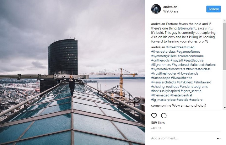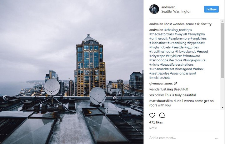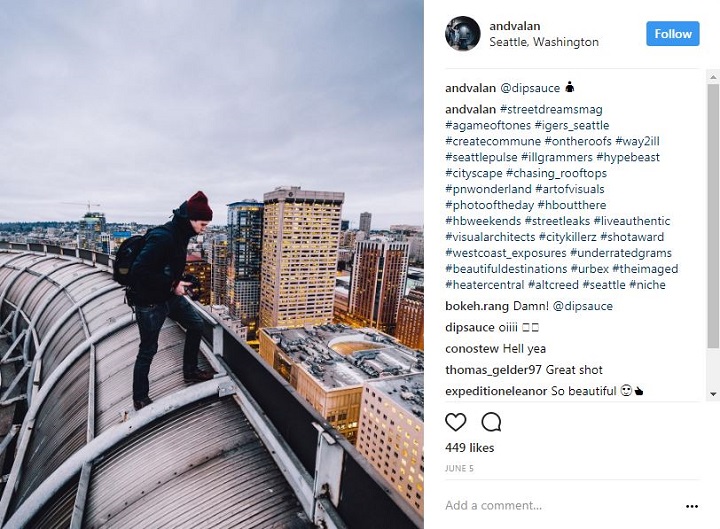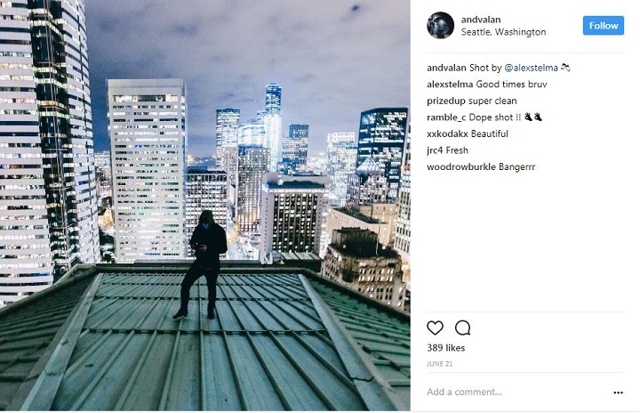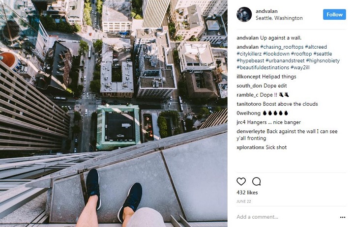 Valentine, who is a Seattle resident, has an Instagram account laden with photos taken on rooftops and building ledges.