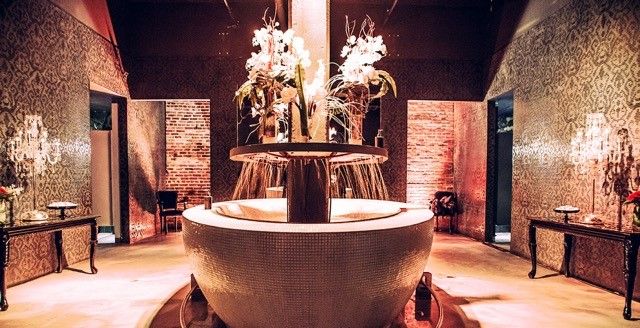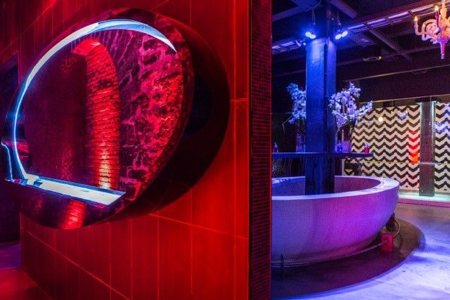 The designs are meant to “provoke and intrigue” guests, whether they walk into a world of Alice in Wonderland or a restroom decked out in glitzy copper piping.