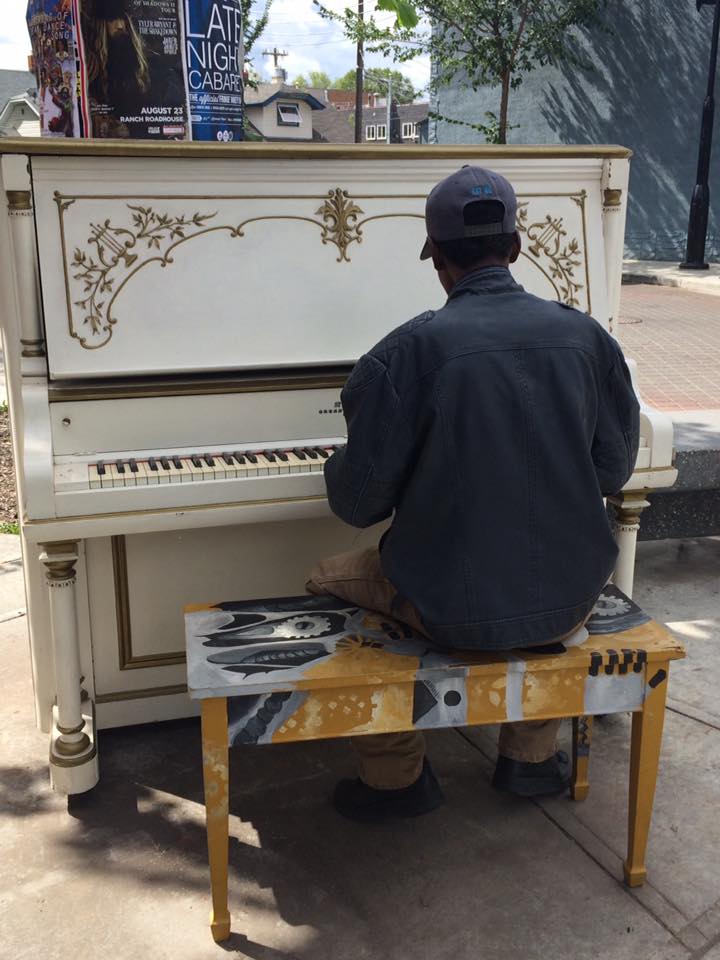 The non-profit café typically puts an upright piano on the corner outside its door, on 118 Avenue and 94 Street.