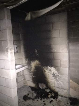 At this point, the investigation revealed that the culprit, or culprits, ignited flammable material in the washroom which then caused damage to wood and vinyl and smoke damage to the interior.