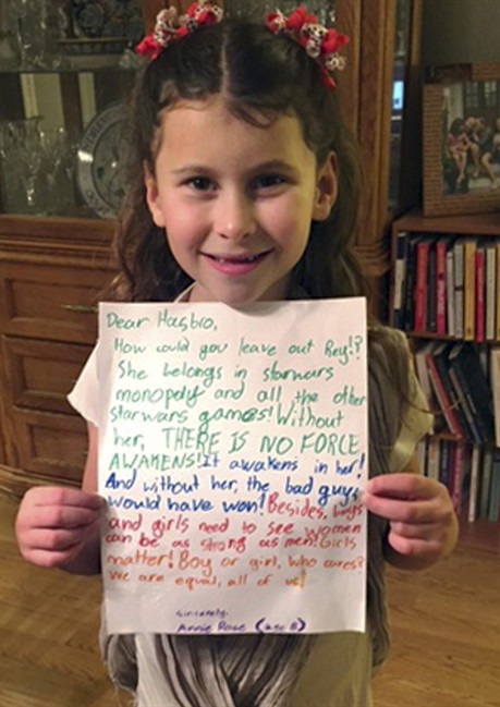 Annie Rose Goldman wrote the letter that sparked the outcry. Her mother, Carrie Goldman, of Evanston, Illinois, said Wednesday she’s happy Annie Rose will be able to get a Rey figure but it’s not how they understood Hasbro’s promise.
