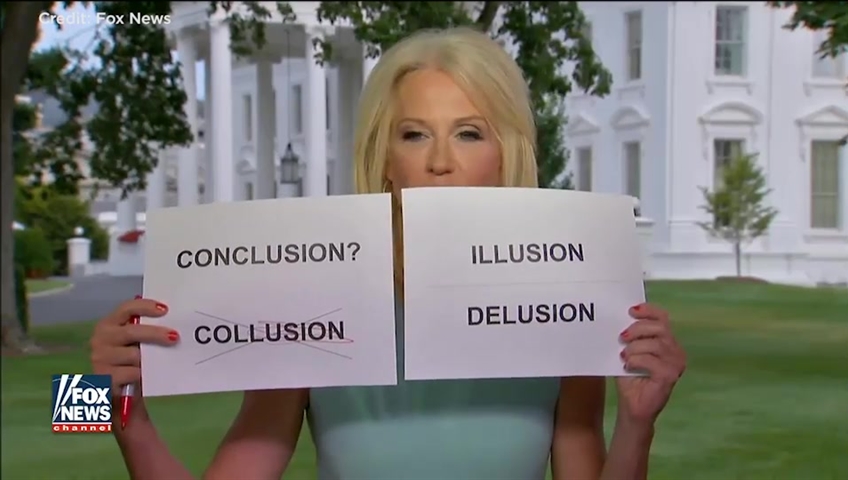 Conway then crossed out the word “collusion” with a pen, and held up a new piece of paper that read “illusion” and “delusion.”
