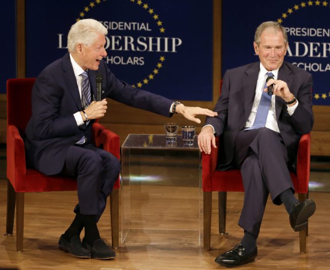 Republican Bush said while in office he sought Democrat Clinton’s advice. Clinton said when he left office he told incoming President Bush that he would offer him help and treat him with respect.