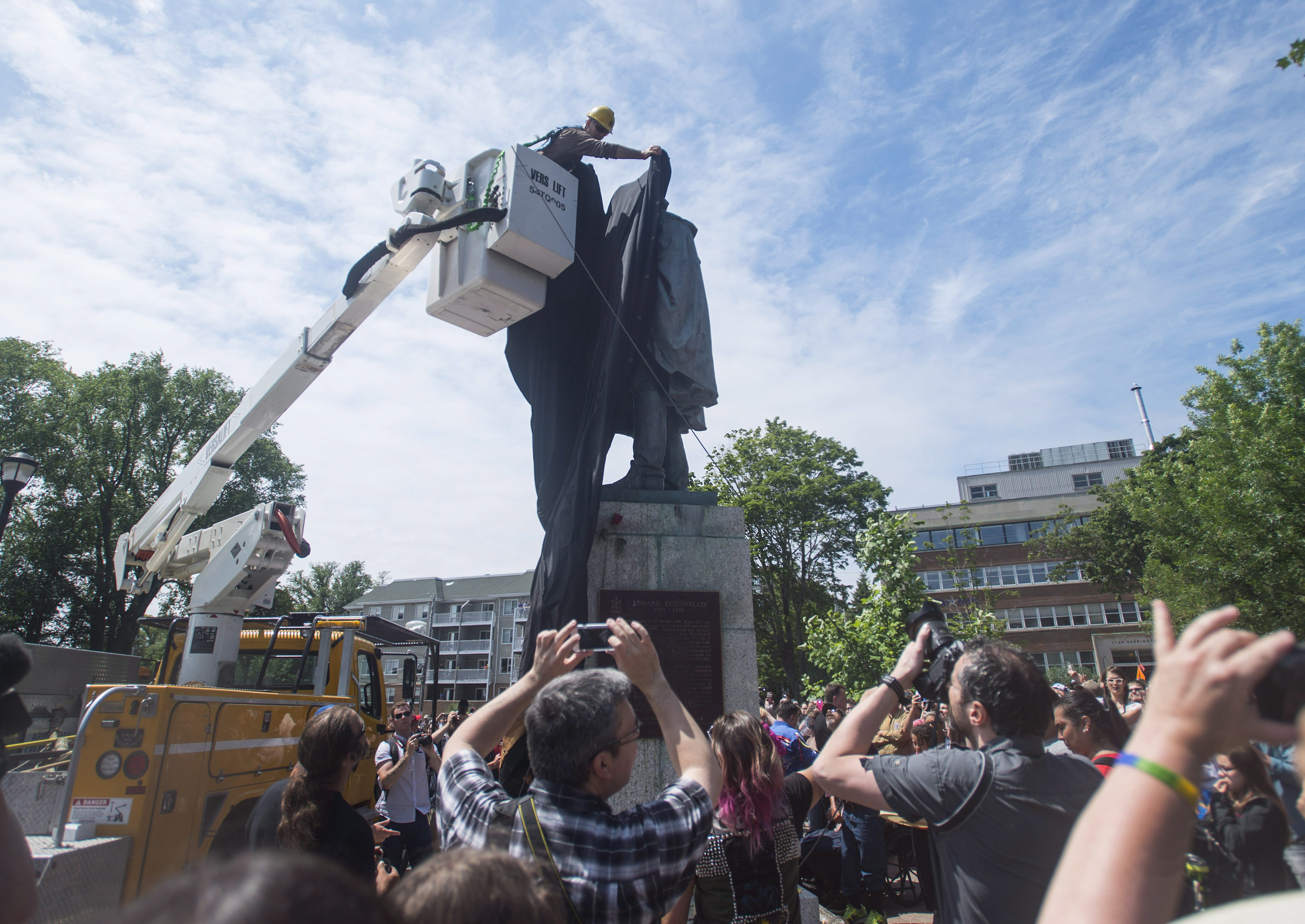 More than 100 people looked up at a municipal worker, hoisted by a crane in a city-owned truck, as he draped a black tarp over the bronze statue at the centre of Halifax’s Cornwallis Park.